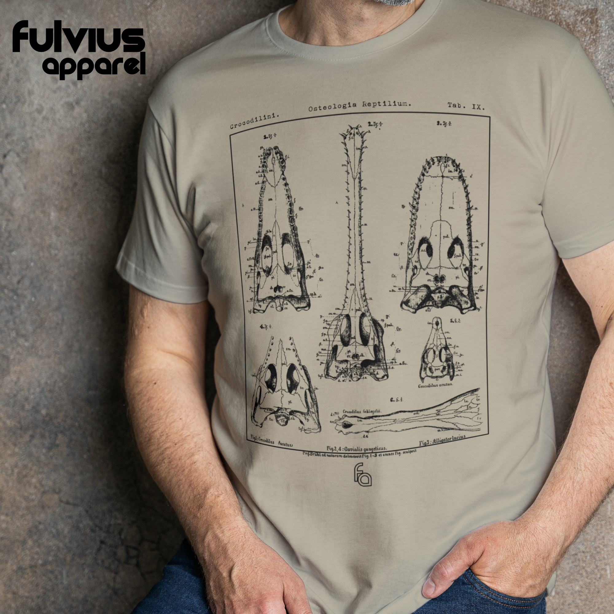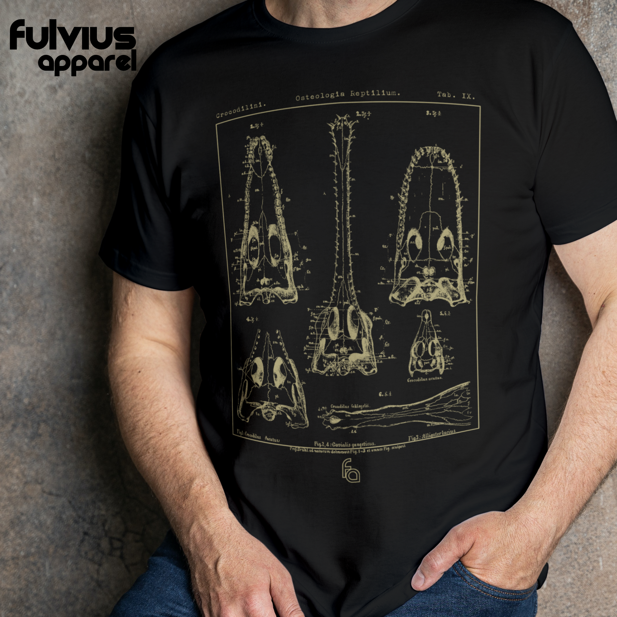 A cool vintage croc skull chart! Printed on an ultra soft 100% ring spun cotton tees. Available in black or sand.