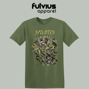 The shirt for those deep in the Spilotes cult! Printed on Gildan Softstyle 100% cotton shirts in either black or military green.